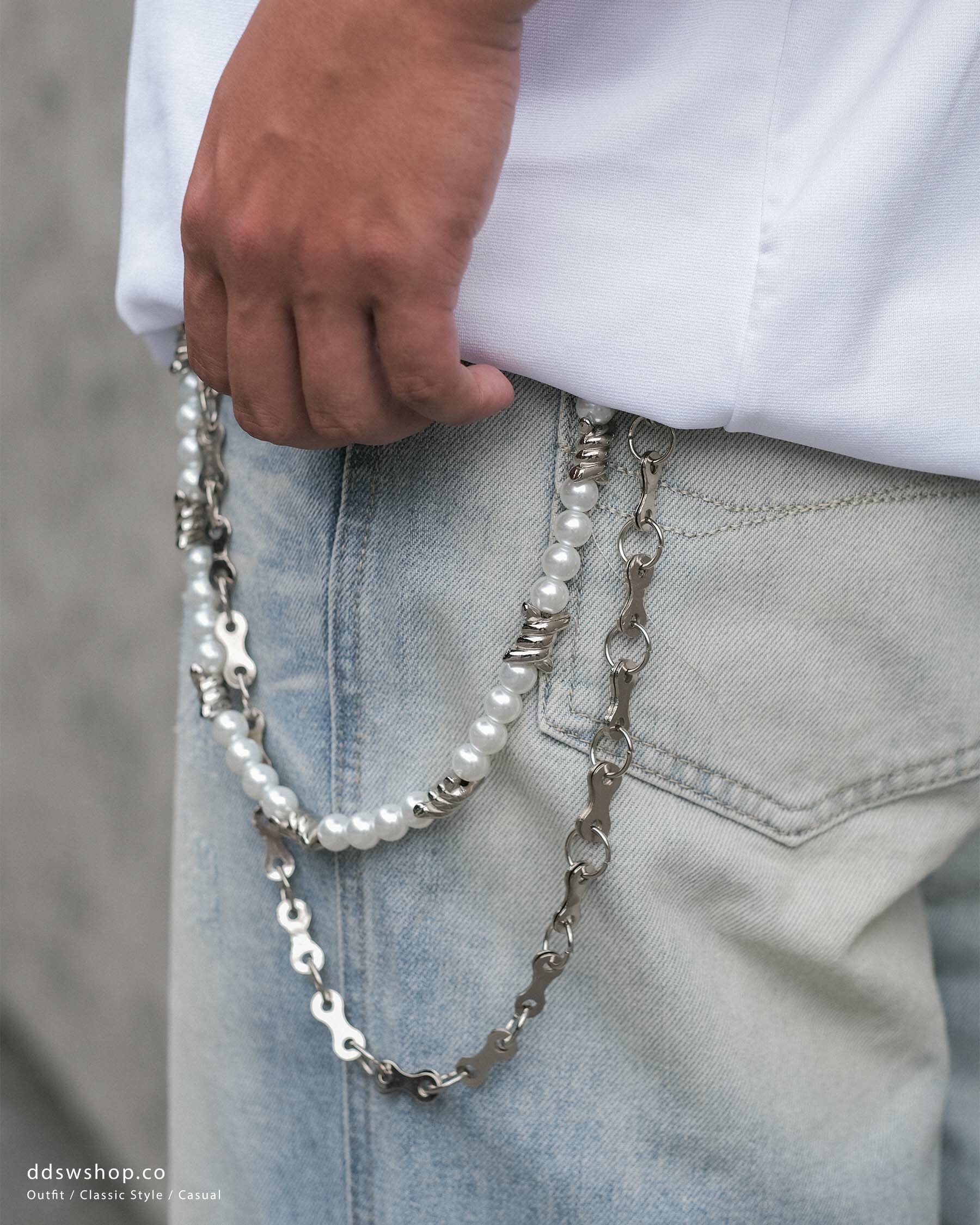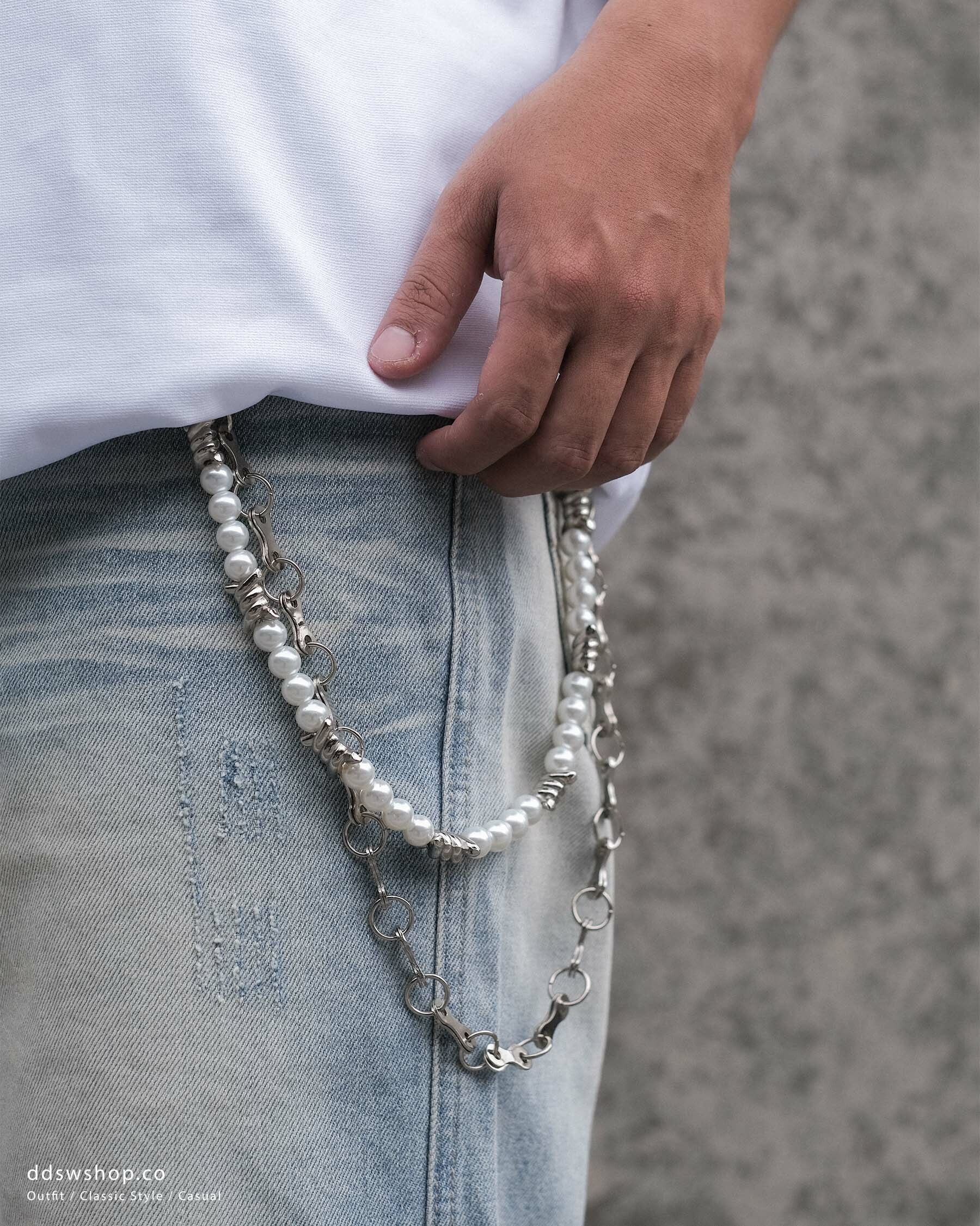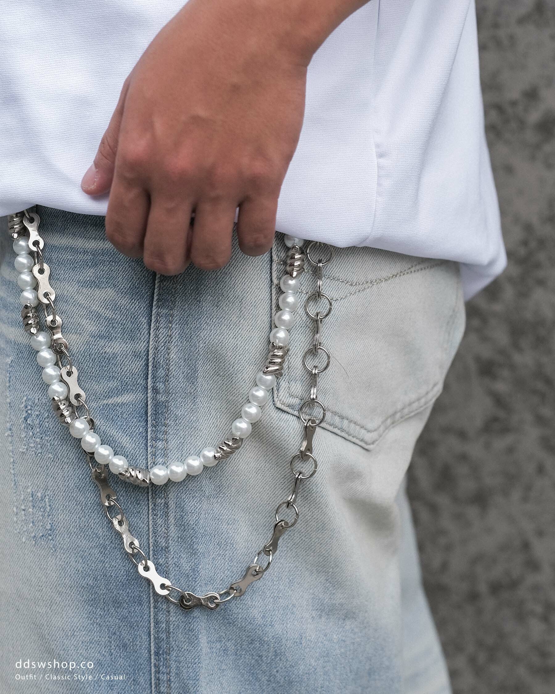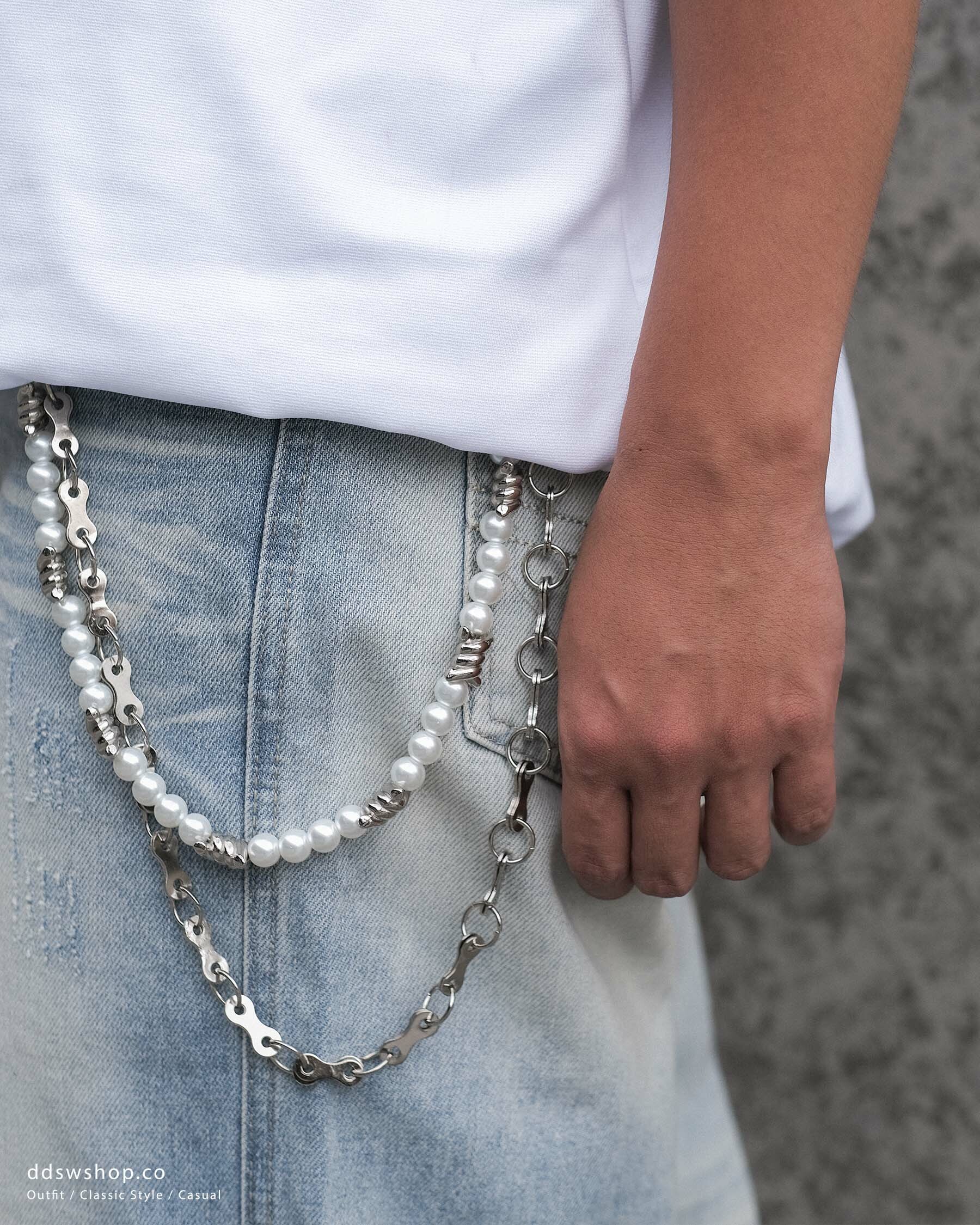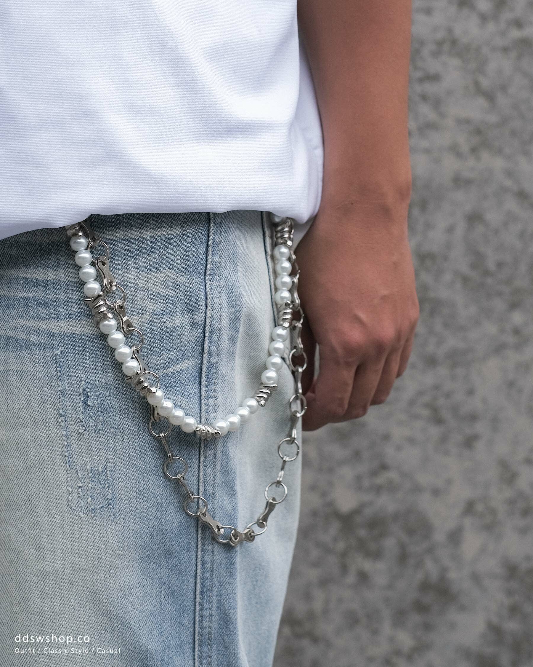 D.CLOSET 珍珠鋼鍊褲鏈,結合優雅與時尚,為您的造型增添一抹亮點。