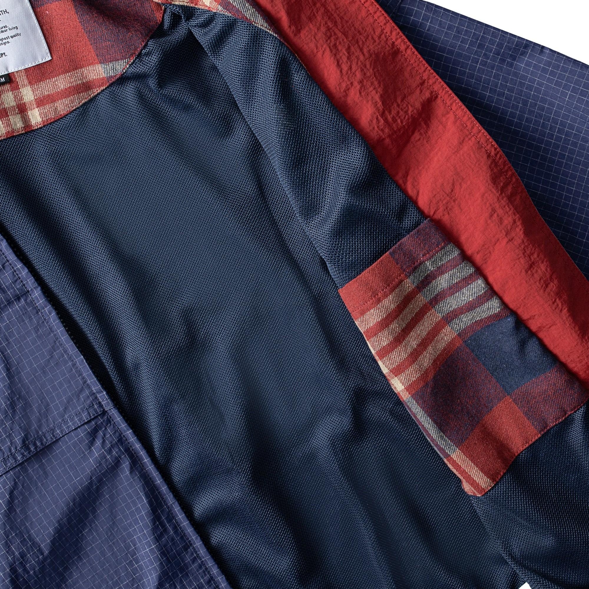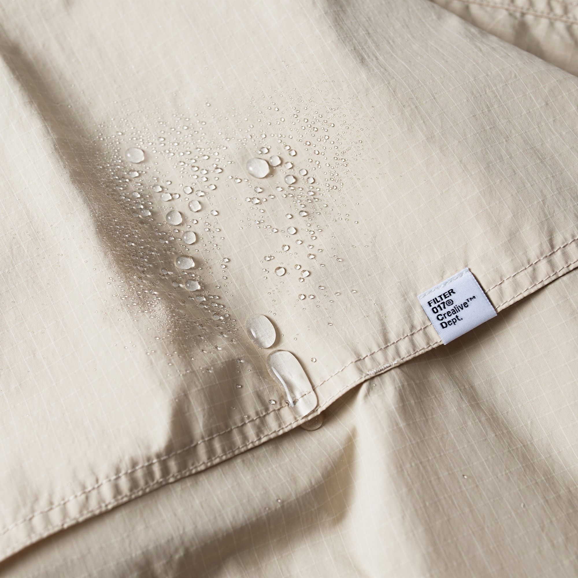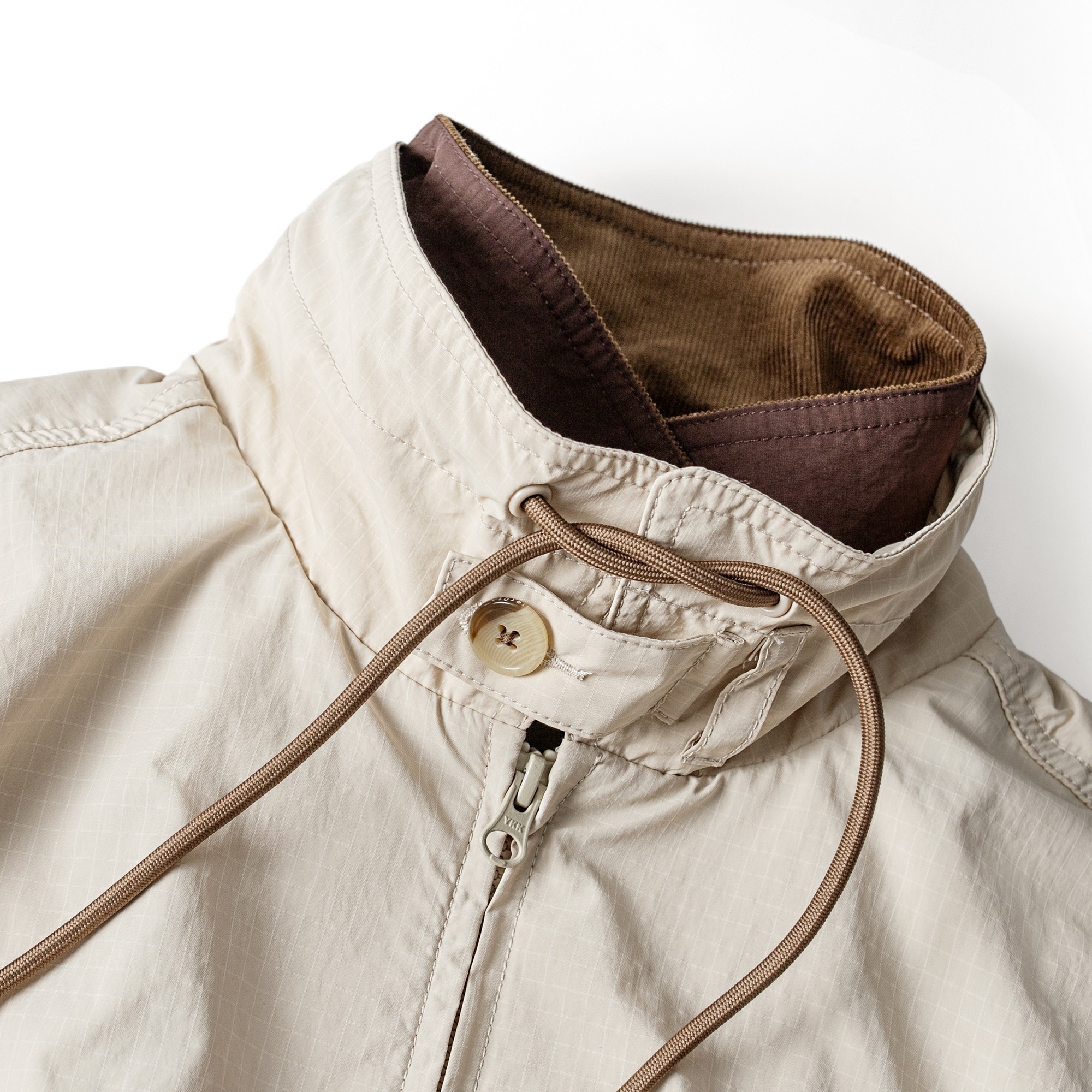 面料使用上則充分銜接流行性與區域氣候,因應亞洲地區多功適用機能,以輕量、防風、防潑水的平織格紋抗撕裂尼龍材質為主體,大面積細目透氣網布內裡及前後蓋片式透氣剪裁設計,穿著搭配與情境轉換實用度上更為靈活便利,滿足防風與搭配層次需求且四季皆宜。背後立領及胸前以精緻工藝刺繡,領口調節裝飾綁繩以品牌字樣包頭設計,更是展現滿載質感與誠意。