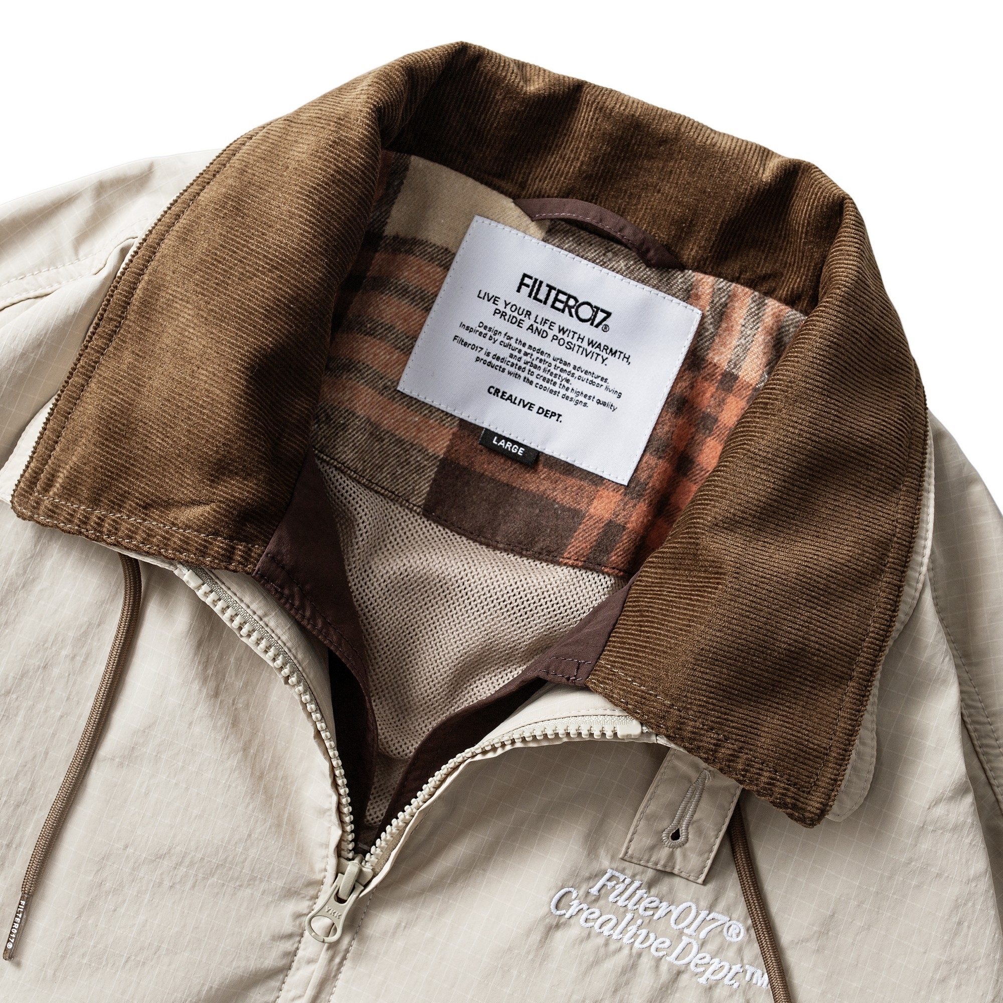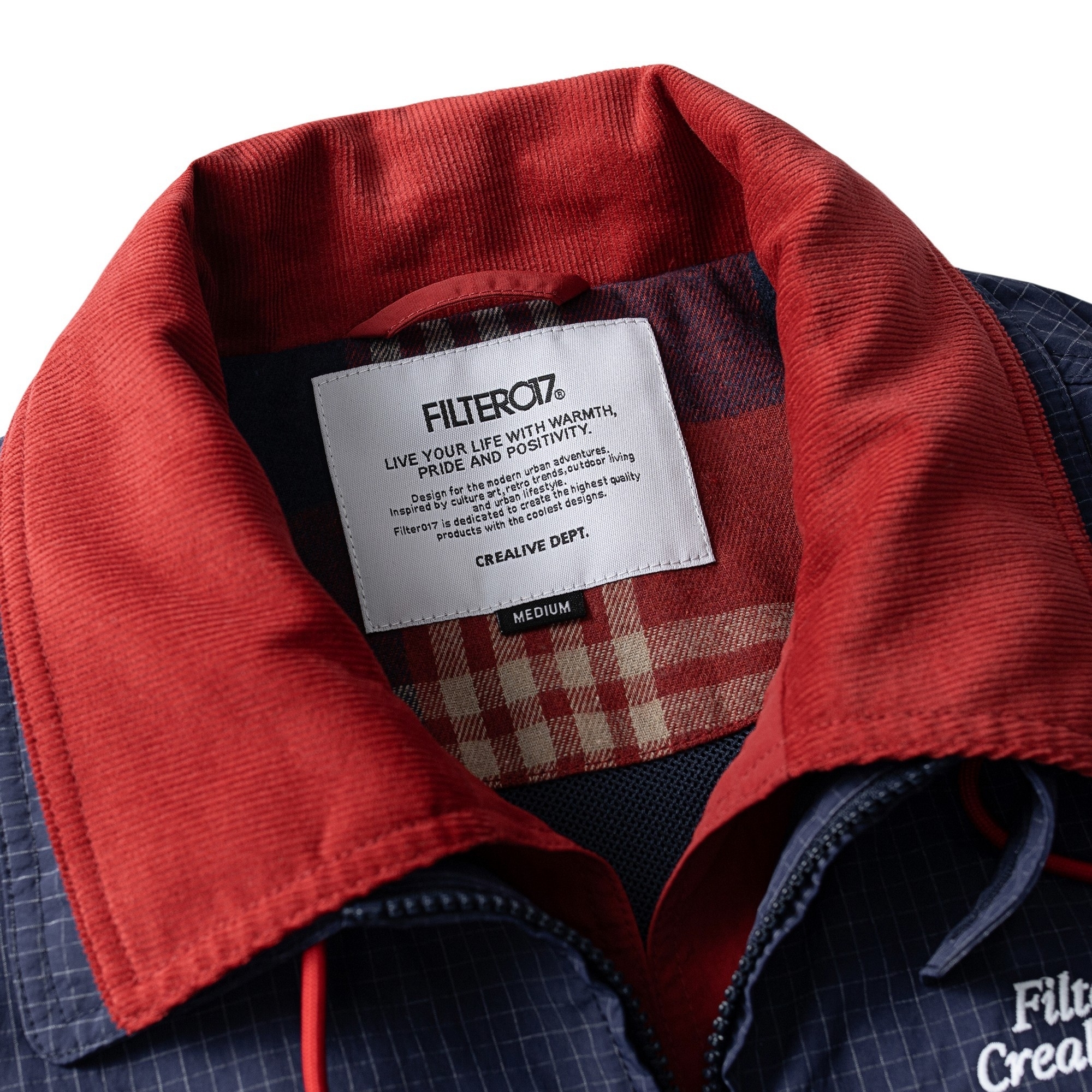 此次所推出的雙領布勞森工作外套為FILTER017®品牌季度重點單品,以英國百年油布夾克品牌之經典元素為設計靈感基礎,剪裁做工與細節揉合Blouson軍工裝外套,並巧妙將70-80年代歐美藍領階層及學院穿著所泛用普及的工作外套造型結合,版形輪廓則以當下街頭流行寬鬆趨勢做為調整方向,於復古與現代面料與機能實用程度上重新建構,大膽玩味混合美式流行文化語彙與服裝元素。細節考究上採用經典法蘭絨格紋內襯與仿玳瑁雕字鈕扣做為復古視覺提點,並以燈芯絨材質配色延伸設計為可翻雙領設計,豐富層次感外亦在防風功能上加分。