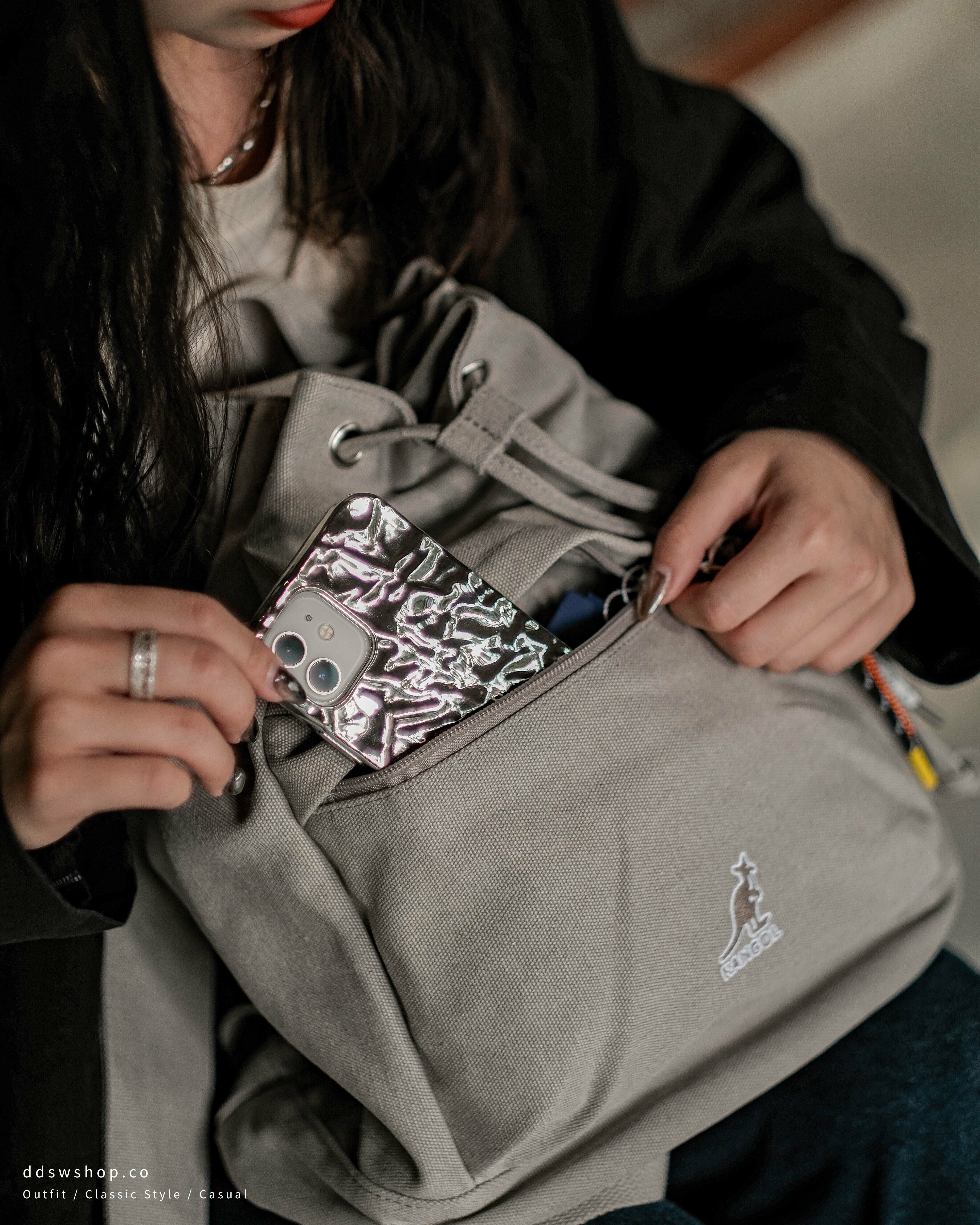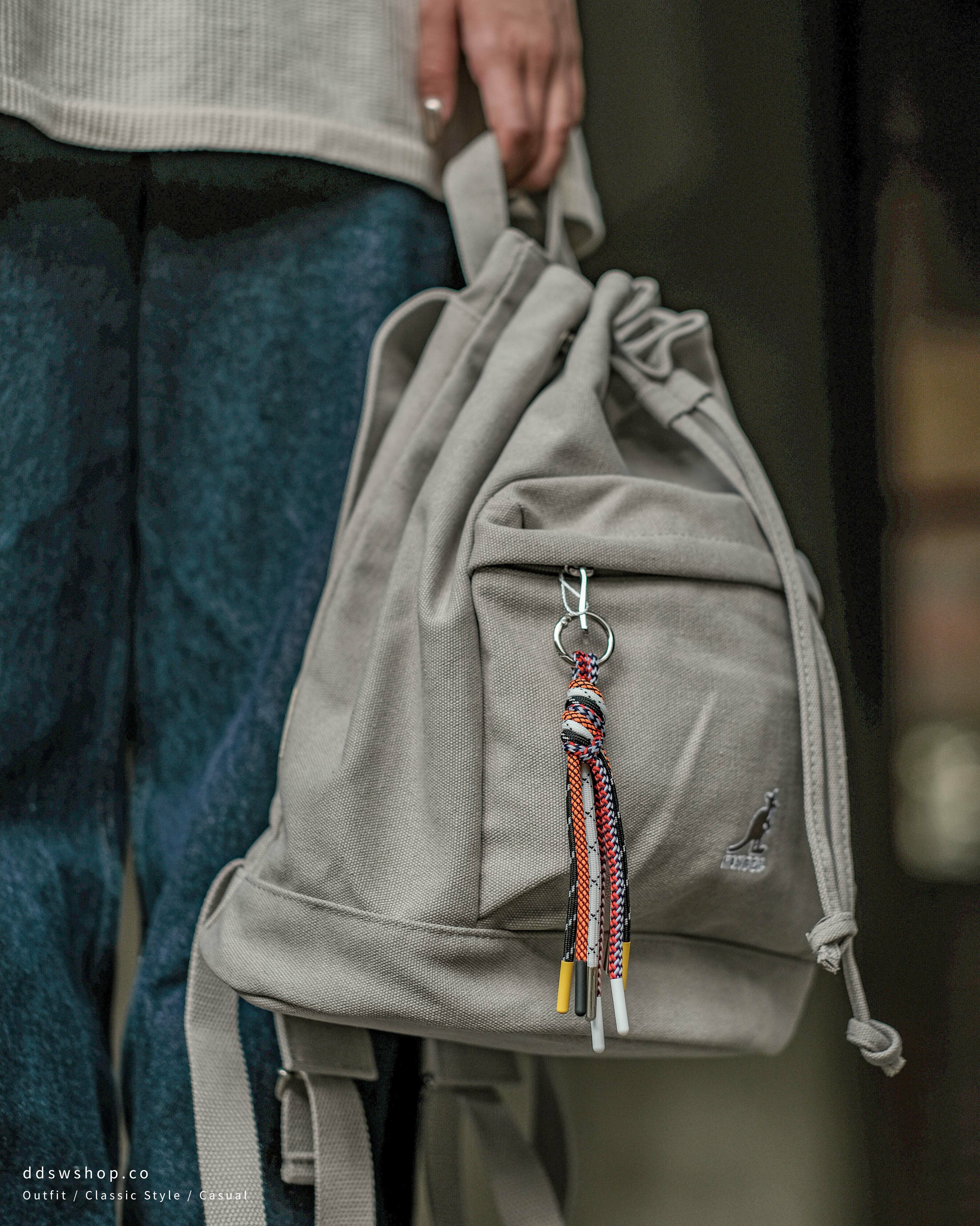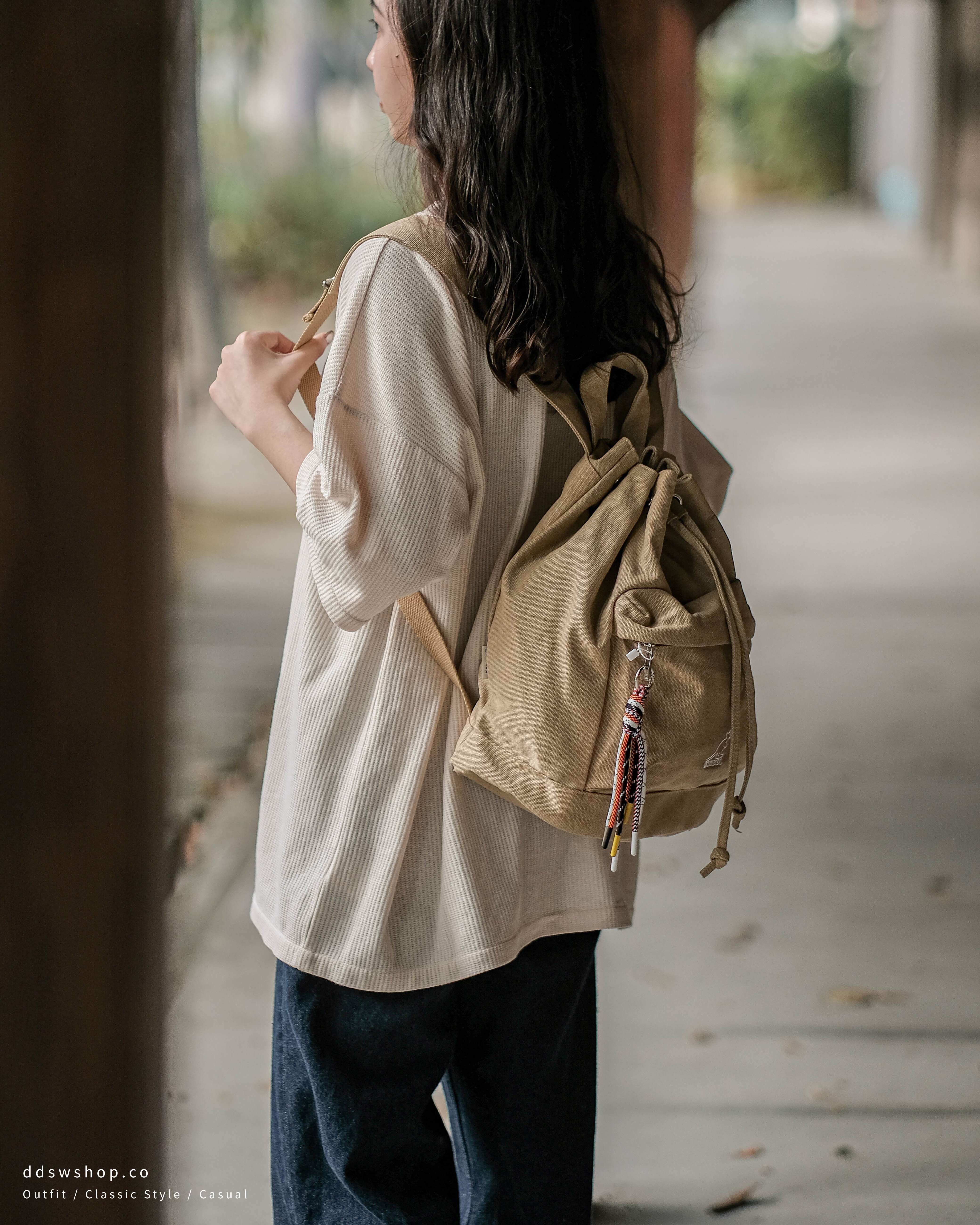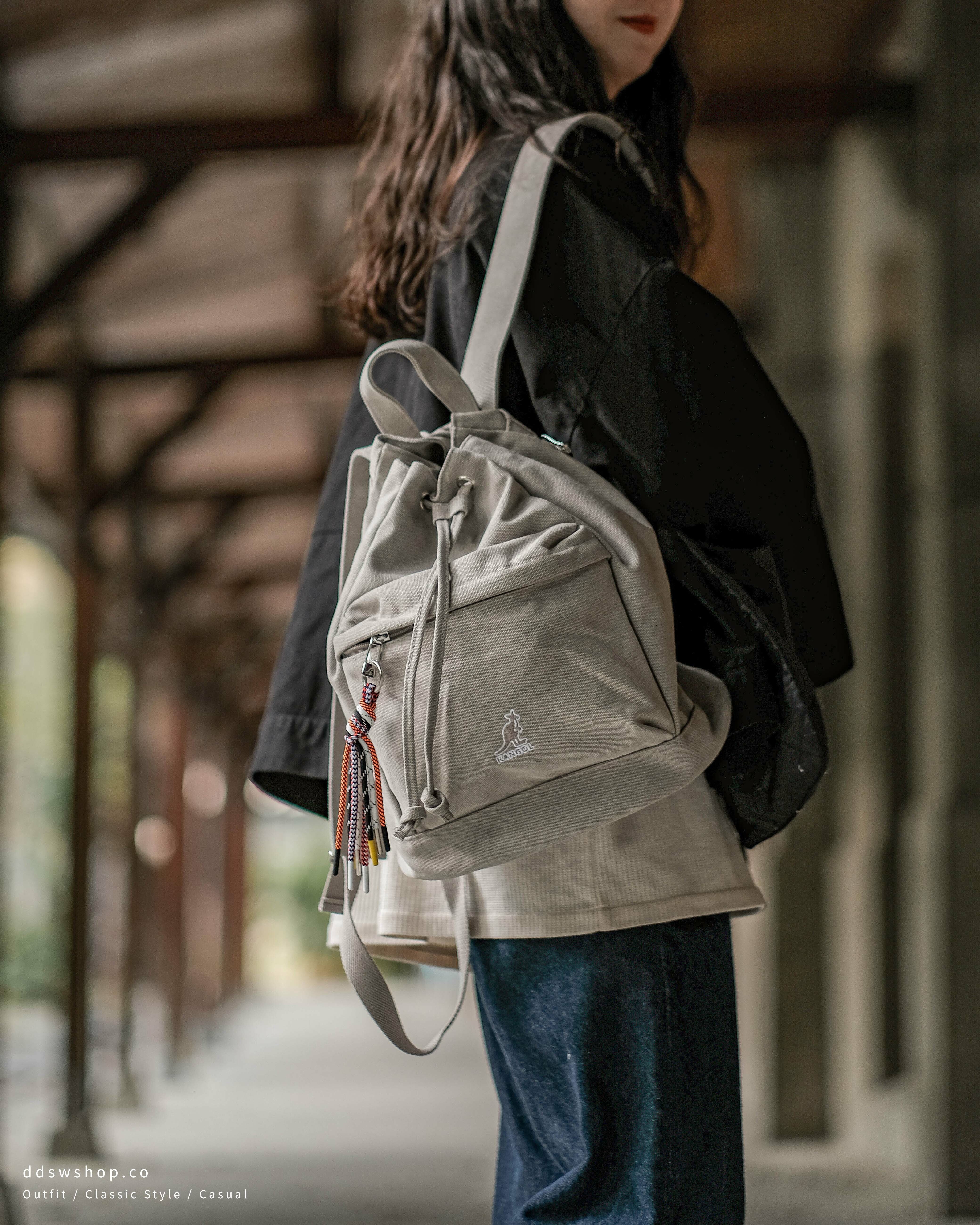 Kangol 袋鼠 包包 後背包 抽繩束口水桶包 日系彩色掛繩 大容量 水洗灰 卡其
